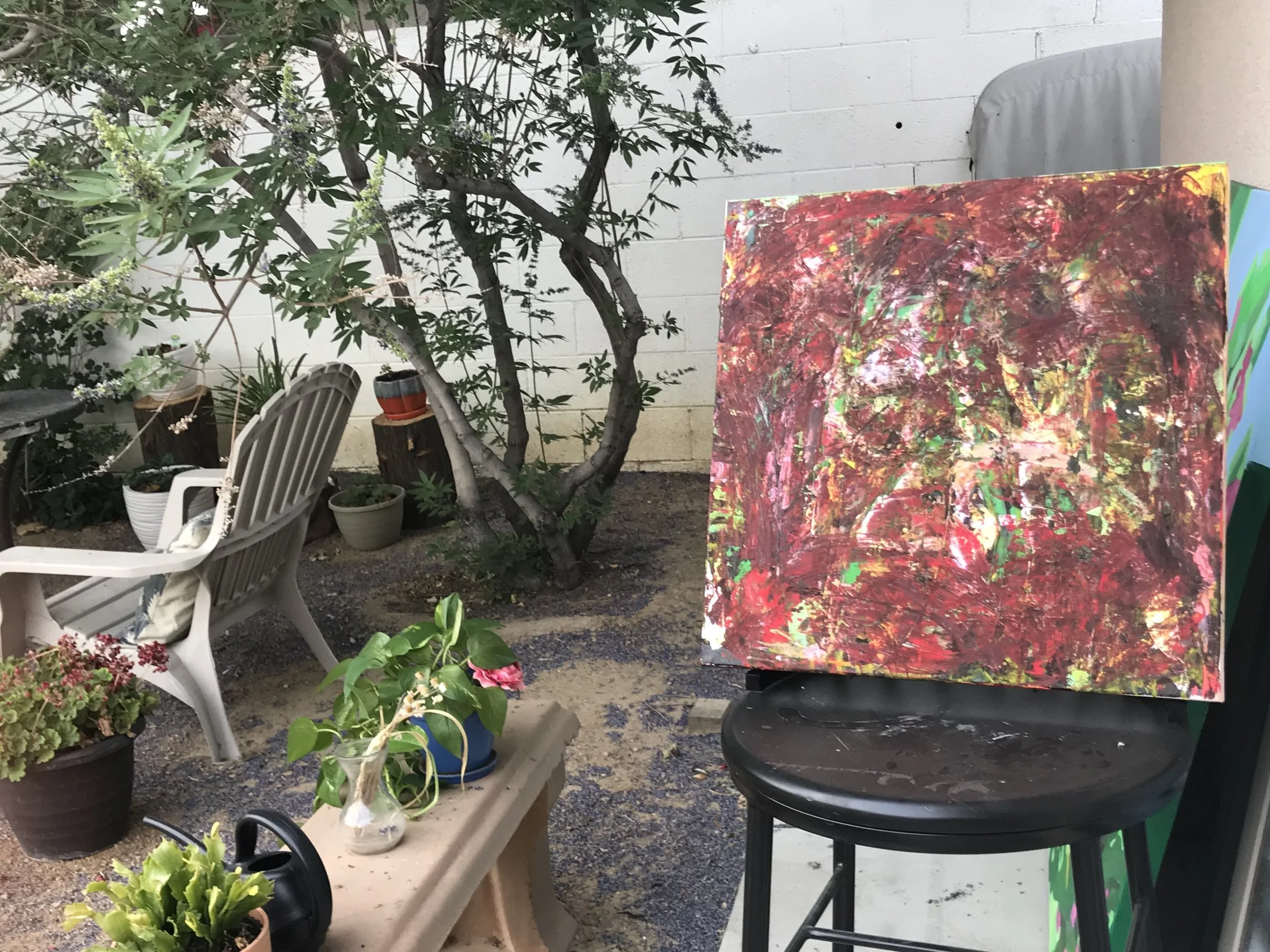 Red painting in the garden.